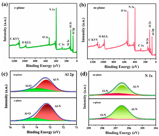 XPS survey of the c-plane (a) and m-plane (b), and Al 2p (c) and N 1s (d) high-resolution XPS spectra of the c-plane and m-plane.