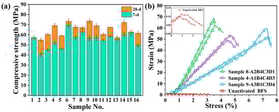 In this paper, 16 groups of samples were prepared by the orthogonal experimental design (OED) method, which can quantify the order of contribution of four influencing factors to compressive strength. In each group of experiments shown in Table 3, we prepared eight samples. The uniaxial compression test results of 16 groups of alkali-activated slag samples are shown in Table 4. In particular, the uniaxial compressive strength shown in Table 4 is the average strength of the three samples. The original data of the test can be found in Table S1 in the Supplementary Material.