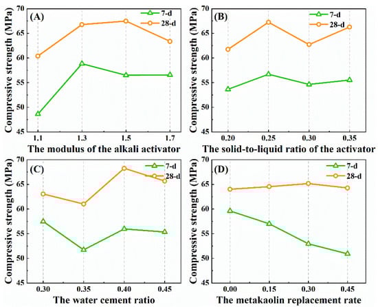 Influence trend of each factor on the strength of the alkali-activated slag sample: (A) The modulus of the alkali activator; (B) The solid-to-liquid ratio of the activator; (C) The water cement ratio; (D) The metakaolin replacement rate.