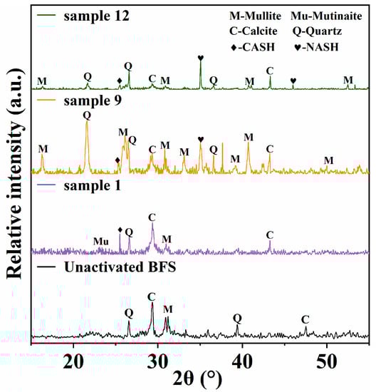The XRD patterns of the alkali-activated slag sample are shown in Figure 4. In the inactivated BFS samples, the main phase composition is calcite and quartz. In particular, we can find that, in sample 1, the main phases are calcite and quartz, which mainly come from incompletely reacted slag particles. The diffraction peak near 25.3° can be considered as the main product CASH gel formed by the alkali-activated slag reaction. At the same time, amorphous aluminosilicate products such as mullite and mutinaite were also formed in the reaction system. Compared with sample 1, the XRD test results of sample 9 show that it contains more intermediate mullite. At the same time, the diffraction peak near 35.0° indicates the formation of new NASH gels. This diffraction peak is also captured in sample 12, but the phase of mullite decreased obviously.