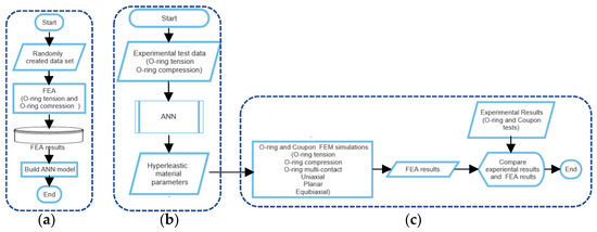 The virtual fields method (VFM) consists of an analytical solution of a constitutive model, digital image correlation, and optimization method. Virtual fields, which can be strain or displacement, are predicted by solving a constitutive analytical model with guess parameters. Then, the virtual prediction is compared to digital image correlation measurements through a cost function to be minimized [48,49]. This approach is applied to determine the hyperelastic material parameters of rubber specimens with a cruciform shape [34,50,51,52]. Similar to the previously described approaches, the selection of the initial parameters and optimization techniques directly affects the quality of the prediction in this approach. Moreover, these indirect approaches are material-dependent, and the procedure must be repeated for another material. The current study identifies different rubbers’ responses for application-specific component geometry that provides O-ring shapes applying a direct material-independent reverse engineering approach. Our goal is to determine the hyperelastic material parameters that will fulfill the application requirements and lead to a suitable selection of rubber. Specifically, we aim to identify the hyperelastic material parameters of different rubbers (silicon, neoprene, and natural rubber) from the developed ANN model without performing experimental coupon tests.