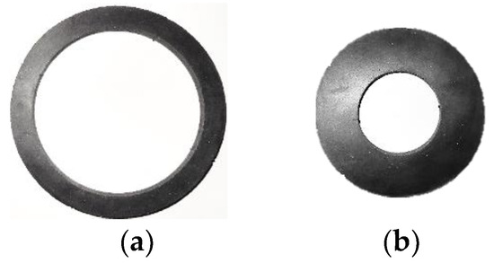 Neoprene rubber, natural rubber, and silicone rubber batches with thicknesses of 25.4 mm, 3.175 mm, and 1.5875 mm supplied from McMaster-Carr were used in this study. Rubbers batches with a thickness of 25.4 mm, were cut with a water jet to outer/inner diameters of Ø127/Ø101.6 mm, Ø101.6/Ø50.8 mm, and Ø50.8/Ø25.4 mm for O-ring tension, O-ring compression, and O-ring multi-contact tests, respectively. Neoprene rubber samples for O-ring tests are shown in Figure 2 and Figure 3.