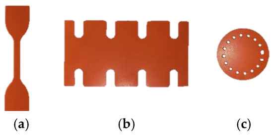 Rubber batches with a thickness of 3.175 mm for uniaxial and equibiaxial tests and rubber batches with a thickness of 1.5875 mm for planar tests were cut with a die. Silicone rubber coupon test samples are shown in Figure 4. Coupon test sample dimensions can be found in our previous study [53].