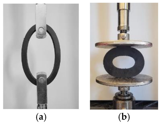 Component test samples used to determine material parameters: (a) O-ring tension test and (b) O-ring compression test.