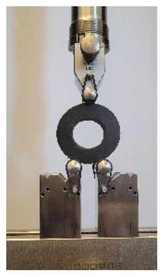 To demonstrate the accuracy of the developed ANN approach, we simulated different conditions. Thus, we aimed to predict the behavior of neoprene’s component when subjected to O-ring multi-contact tests at various environmental conditions (not only the ambient). To compare the outcomes of the ANN approach, actual test data were required; hence, we performed O-ring tension and O-ring compression of the neoprene test (Figure 2) with the setup shown in Figure 5. We repeated the same experimental procedure at the elevated temperatures of 50 °C and 80 °C and compared them with the corresponding FEA results.