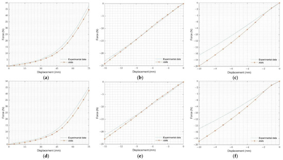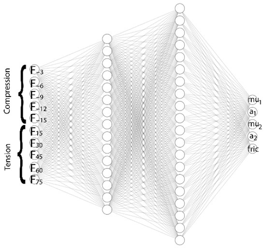 The force-displacement curves of the virtual data sets (100 cases) corresponding to the geometry-specific simulation, shown in Figure 9, were used to build the ANN in the commercial software of MATLAB 2021a. Specifically, the force values obtained from the O-ring tension and O-ring compression FEA simulations were selected as inputs, and Ogden-2 hyperelastic material parameters were selected as outputs. The same data quantities were taken from the O-ring tension and O-ring compression FEA simulations to prevent overfitting and obtain uniform distribution in the ANN model. The force values at each 15 mm displacement in the virtual O-ring tension FEA results and the force values at each 3 mm displacement in the virtual O-ring compression FEA results were used for the ANN training database. The ANN structure is shown in Figure 10.