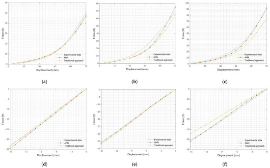 In order to guarantee that the resulting material parameters provide stable models, we created Abaqus scripts for evaluating the randomly created parameters (Table 1). The outcomes showed stability for all cases according to Drucker’s stability criteria. The corresponding virtual curves of force and displacement obtained from the O-ring tension and O-ring compression FEA simulations are shown in Figure 9. It must be noted that these virtual data sets correspond to the geometry-specific application (O-ring tension and O-ring compression) but are material-independent; namely, they can be used for any rubber, as will be proved in the following sections.