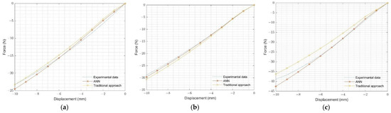 ANN-predicted Ogden-2 hyperelastic material parameters of neoprene rubber, natural rubber, and silicone rubber were validated using the O-ring multi-contact component test. Validation of the O-ring multi-contact results for the selected rubbers is shown in Figure 12. The developed-ANN model provided accurate estimates for all selected rubbers.