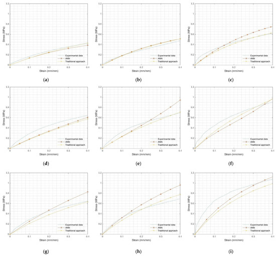 FEA coupon (uniaxial, planar, and equibiaxial) test simulations were also used to validate selected rubbers’ ANN-predicted Ogden-2 hyperelastic material parameters. The FEA results, using hyperelastic material parameters predicted by the ANN model and determined with the traditional approach, were compared with the experimental coupon test results of these rubbers in Figure 13. Figure 13 presents the accuracy of the Ogden-2 model for selected rubbers, and it can be claimed that Ogden hyperelastic material model was successfully applied to the analysis of O-rings.