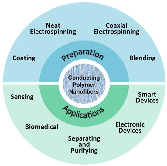 A wide variety of inexpensive, commercially available (“commodity”) polymers have been electrospun, but there are inherent difficulties associated with electrospinning CPs. This review focuses on the production of CP nanofibers via electrospinning, as well as the applications of CP nanofibers (Figure 2). A brief background on CPs and the electrospinning process is provided, followed by a discussion of the approaches used to incorporate CPs into electrospun nanofibers. A summary of recent advances and suggestions for future work in electrospun CP applications conclude this review. Many thousands of publications on electrospun CP nanofibers are available; thus, this review focuses on some exemplary highlights of efforts in this area.