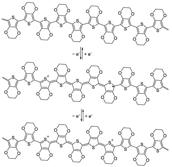 Reversible oxidation and reduction processes form resonance-delocalized electrons and cations (holes) along the backbone of CPs such as PEDOT. Redox processes, which are typically reversible, allow interconversion among neutral polymers (top), radical cations known as polarons (middle), and dications known as bipolarons (bottom). Reprinted from Ref. [45], available at https://www.mdpi.com/1996-1944/12/16/2629; accessed on 1 December 2022.