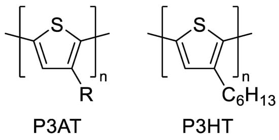Polythiophenes have become one of the most widely used and researched CPs primarily because of their relative stability in oxygen and moisture [112]. While polythiophene (PT) is an insoluble material, polymerization of alkyl-substituted thiophenes with propyl or longer alkyl chains yields poly(3-alkylthiophene)s (P3ATs, Figure 4) that are soluble in organic solvents and mechanically processable. Long-chain alkoxy groups exhibit several advantages over alkyl substituents, such as increased solubility and a significant reduction in polymer Eg due to the electron-donating nature of the alkoxy substituent [109,110,111]. Poly(3-hexylthiophene) (P3HT) (Figure 4) is one of the most notable and widely researched CPs.