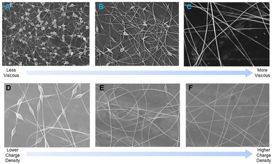 Increasing viscosity or conductivity (charge density) reduces bead formation [135]. Top: Scanning electron micrographs (SEMs) of electrospun aqueous poly(ethylene oxide (PEO). The horizontal edge of each image is 20 µm long: (A) 1.5 wt.% PEO, 32 cP; (B) 3 wt.% PEO, 289 cP; (C) 4 wt.% PEO, 1250 cP. Bottom: Electrospun 3 wt.% PEO with increasing NaCl content: (D) 15 ppm NaCl, 1.23 C·L−1; (E) 300 ppm NaCl, 3.03 C·L−1; (F) 1500 ppm NaCl, 28.8 C·L−1. Reprinted from Ref. [135], Copyright 1999, with permission from Elsevier.