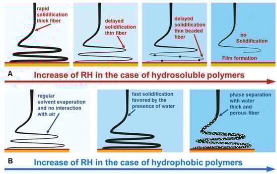 Effect of increasing relative humidity (RH) on (A) water-soluble and (B) hydrophobic electrospun polymers. Reprinted from [168]. Copyright 2021, John Wiley & Sons.