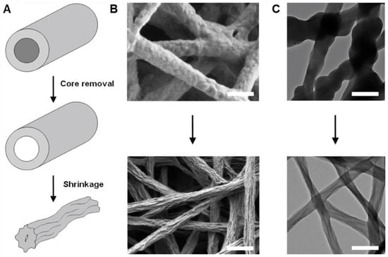When blends of PANI and PMMA would not electrospin due to insufficient elasticity of the polymer solutions, Zhang and Rutledge [182] utilized coaxial electrospinning to generate PANI/PMMA nanofibers, using emeraldine base PANI (Mw = 65,000 Da) dissolved in chloroform for the inner core and poly(methyl methacrylate) (PMMA, Mw = 540,000 Da) dissolved in N,N-dimethylformamide (DMF) as the outer shell. Smooth and continuous PANI/PMMA nanofibers were obtained with diameters ca. 1440 nm. The PMMA outer shell could be removed via immersion in an isopropanol solution for 1 h to yield neat PANI nanofibers with decreased diameters of ca. 620 nm (Figure 12) and conductivities of 50 S·cm−1.