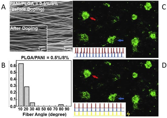 Inherently conductive polymers (CPs) possess conjugated backbones that can be reversibly oxidized and reduced via chemical or electrochemical means. Changes in oxidation state are accompanied by changes in properties including conductivity, color, reactivity, and volume. In the year 2000, the Nobel Prize in Chemistry was awarded to Alan Heeger, Alan MacDiarmid, and Hideki Shirakawa, for their critical work in the field of CPs. CPs have superior electrical and optical properties that are comparable with those of metals and inorganic semiconductors [1]. They display high conductivity/weight ratios and excellent control of the electrical stimulus [2]. CPs are used in a wide range of organic electronic applications including organic photovoltaic cells [1,3,4,5,6,7,8], organic light-emitting diodes (OLEDs) [1,3,7,8,9,10,11], field-effect transistors (FETs) [3,12,13,14], organic thin-film transistors (OTFTs) [7,15,16,17], electrochromic devices [3,4,18,19,20,21,22], antistatic/anticorrosion coatings [1,7,23,24,25,26,27,28], batteries [1,29,30,31], and chemical sensors [32,33,34]. The chemical, electrical, and physical properties of CPs can also be specifically tailored to the needs of the application by incorporating antibodies, enzymes, or other biological moieties [2,35,36,37,38,39,40,41,42,43,44,45]. Various CPs, including polyaniline (PANI), polypyrrole (PPy), and polythiophene (PTh) (Figure 1) have demonstrated biocompatibility, redox stability, conductivity, and excellent electrical and optical properties [1,46,47,48]. Even after synthesis, some of the properties of these CPs can be altered and controlled through stimulation (e.g., changes in electricity, pH, and light) [2,40,41,49] indicating that CPs can be used as actuators [7,43]. This makes these CPs excellent candidates for applications in biomedicine, tissue/nerve engineering applications [50,51], biosensors [44,45], and bioelectronic devices [7,52]. CP nanofibers would be particularly useful for electroactive fabrics, sensors, actuators, and tissue engineering.
