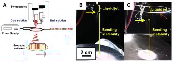 Electrospinning setups are versatile and commercially scalable, with various manufacturers making and selling industrial-sized electrospinning equipment [123,124,125,126]. In its most basic form, an electrospinning setup simply requires a high voltage power supply, a syringe pump, a syringe, a needle, and a collection plate [127]. When an electrical charge is applied, Coulombic repulsion forces are generated in the polymer solution between charges of the same polarity; these forces destabilize the hemispherical droplet of the polymer solution at the tip of the nozzle to form a droplet of conical shape called the “Taylor cone” [128]. As the applied electrostatic field strength increases, the Coulombic repulsion force eventually exceeds that of the surface tension, resulting in the ejection of an electrically charged jet of polymer solution. This charged jet travels in a straight path for a small distance before bending instability forces it into a looping path. On the path to the collector plate, the charged jet elongates while drying out or solidifying, depositing ultrafine fibers on the collector [128]. Collection plates may be replaced with drums; at speeds of ≥1000 rpm, nanofiber alignment may occur (Figure 6) [127,129,130].