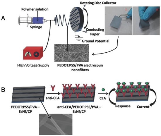- Kumar, S.; Rai, P.; Sharma, J.G.; Sharma, A.; Malhotra, B.D. PEDOT:PSS/PVA-Nanofibers-Decorated Conducting Paper for Cancer Diagnostics. Adv. Mater. Technol. 2016, 1, 1600056. [Google Scholar] [CrossRef]