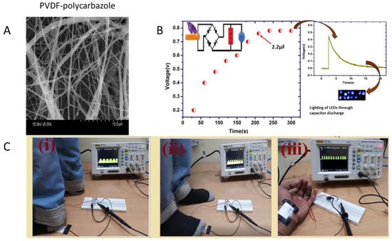 - Sengupta, A.; Das, S.; Dasgupta, S.; Sengupta, P.; Datta, P. Flexible Nanogenerator from Electrospun PVDF-Polycarbazole Nanofiber Membranes for Human Motion Energy-Harvesting Device Applications. ACS Biomater. Sci. Eng. 2021, 7, 1673–1685. [Google Scholar] [CrossRef]