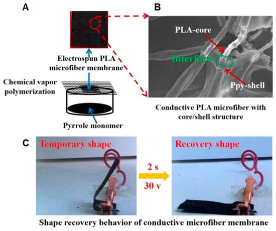 - Zhang, F.; Xia, Y.; Wang, L.; Liu, L.; Liu, Y.; Leng, J. Conductive Shape Memory Microfiber Membranes with Core-Shell Structures and Electroactive Performance. ACS Appl. Mater. Interfaces 2018, 10, 35526–35532. [Google Scholar] [CrossRef]