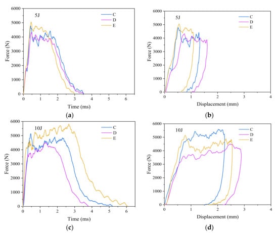 Figure 4b,d,f show the edge impact force-displacement curves of groups A, B and C CFRP laminates at the impact energy of 5, 10 and 15 J. The changing trend of impact force-displacement curves of CFRP laminates is the same as that of impact force-time curves of CFRP laminates shown in Figure 4a,c,e.