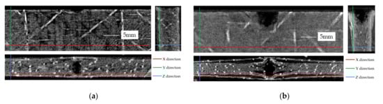 Because the density at the position of the laminates changes after damage, and the light intensity changes with the different density of materials, so the damage of the specimen is characterized by the gray scale of the image in the CT scanning results. Figure 10 shows the damage in the XY, YZ and XZ cross-sections of CFRP laminates with the unstitched laminates in group A subjected to edge impact of 5 and 15 J, and the stitched laminates in group D subjected to edge impact of 15 J.