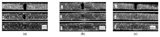 The CT technique allows not only the observation of the damage of the specimen in each cross-section, but also the specific observation of the damage evolution along a certain coordinate direction. Figure 11 shows the damage evolution images of the XZ cross-sections of each group of specimens at the impact energy 5 and 15 J. In each graph, because CT scans layer by layer, the first layer is the impact surface and the corresponding XZ cross-section is taken along the impact direction—that is, the negative direction of the Y axis (as shown in Figure 2c). The scan spacing is 0.129 mm (which is determined by the scanning resolution of the equipment). For example, the nth layer has gone down by (n−1) spacing from the impact surface along the negative direction of the Y axis, which is 0.129 × (n−1) mm. The number of layers of the last image in each group of figures is the deepest layer where the damage reaches. For example, in Figure 11f, the deepest damage reaches 0.129 × (62−1) = 7.869 mm from the impact surface.