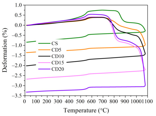 At temperatures exceeding 600 °C, expansion gradually loses intensity up to 845 °C in the CS ceramic body, at which point these materials reach their maximum expansion, as shown in Figure 6. For samples with OCW addition, expansion finishes at lower temperatures: for CD5 at 835 °C, for CD10 at 810 °C, for CD15 at 790 °C, and for CD20 at 780 °C. The maximum expansion for composition CS is 0.75%, and that of compositions with OCW is lower. As described previously [33], the maximum expansion is inferior in ceramic bodies with OCW, due to the creation of a more porous structure in this material after the burnt out of its organic compounds. For composition CD20, expansion reaches 0.375%, meaning that OCW addition of 20% reduced expansion deformation by 71%, from 0.75 to 0.215%. Maximum expansion values from 0.75–0.215% are deemed reasonable for ceramic product manufacturing for construction [33]. This is highly important, as during the modification of quartz minerals the ceramic body is not completely developed, and expansion deformations may be given rise to cracking of ceramic structure that can deteriorate the ceramic body’s characteristics. This phenomenon can be justified by the porous structure of diatomaceous earth, and by lower quartz amounts (down to 10%) in ceramic bodies with added OCW [64].