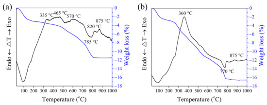 The clearly recognized CaCO3 and MgCO3 decarbonation endothermic effects coinciding with the onset of the contraction process were observed at 800 °C in the case of CS, and at 770 °C in the case of CD20. Loss of mass during the decarbonation process reaches 2.5–3%. A small exothermic peak appears in the DTA curve with a peak value at 875 °C, due to MgO oxidation. It is also important to highlight that, after thermal treatment up to 1000 °C, mass loss in the CS ceramic body reaches 11.5%, while in the CD20 ceramic body mass loss was higher, reaching 16.5%.