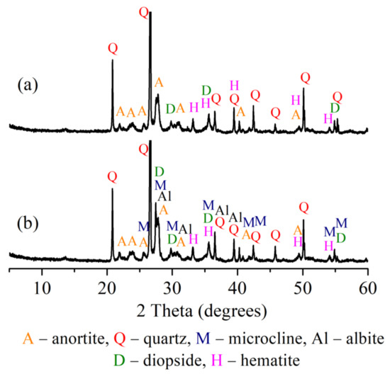 The crystalline phases are developed during sintering at 1060 °C, as can be seen from the XRD curves. XRD curves show that, during decomposition, CaO and MgO oxides react with Al2O3 and SiO2, originating from the deterioration of the phyllosilicates, to create calcium aluminates and silicates. In the case of composition CS, anorthite, a small amount of diopside, hematite, and quartz (with the most intense peaks) are crystallized (Figure 9). In composition CD20 where the higher amount of alkaline compounds Na2O, K2O, and alkaline–earth metal compounds such as magnesium and calcium, is present due to the chemical composition of OCW, it can be seen that the available MgO and CaO are involved in diopside (CaMgSi2O6) formation, which is the main phase formed for this composition. Alkaline compounds Na2O and K2O appear in new crystalline phases such as microcline (KAlSi3O8) and albite (NaAlSi3O8). Similar results for ceramic compositions with diatomaceous earth after firing have been reported [64,67,68,69]. It is also stated that such crystalline phases contribute to the improvement of mechanical strength in ceramic bodies. The intensities of hematite and quartz peaks do not change.