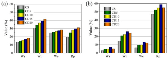 Water absorption (Ws), apparent porosity (Wr), effective porosity (We), and reserve pore volume (Rp), of the ceramic bodies fired at (a) 1000 °C and (b) 1060 °C.