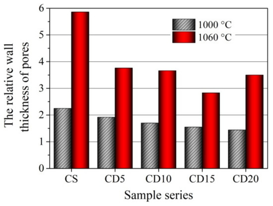 The relative wall thickness of pores in the ceramic samples fired at 1000 °C and 1060 °C temperatures.