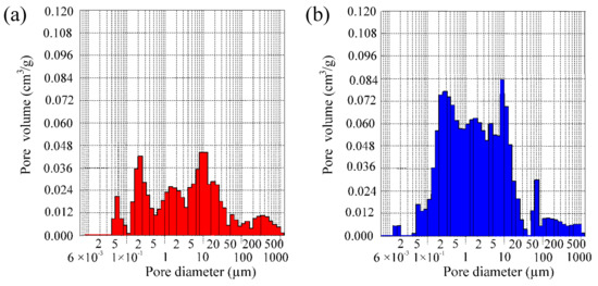 The evolution of porosity caused by the firing and combustion at 1060 °C can be seen additionally in the pore size distribution (by volume) of compositions CS and CD20 (Figure 12). The analysis showed that pore size distribution is multimodal. According to mercury porosimeter measurements, in the CS sample, the largest volume of 0.061 cm3/g is occupied by pores with diameters ranging from 0.1–40 µm. In sample CD20, the volume of 0.1–20 µm diameter pores increased by 2.2 times, up to 0.1354 cm3/g. According to a previous report [64], because of the evolution of crystalline and vitreous phases that progressively seal pores smaller than 0.2 µm, pores smaller than 0.1 µm are practically not observed. This was also confirmed by dilatometric curves, showing shrinkage at this temperature (Figure 6).