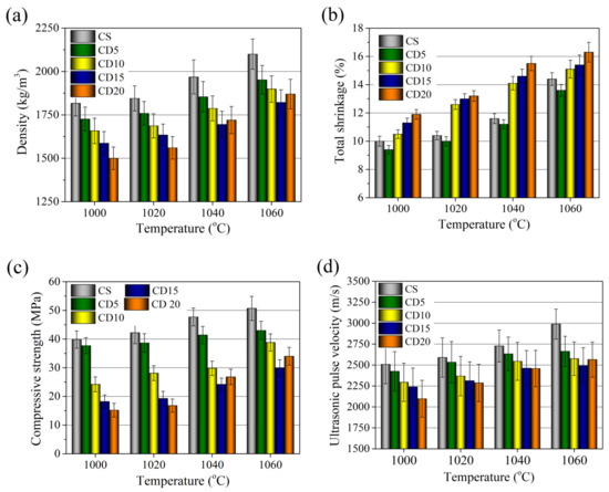 Physical and mechanical properties of the ceramic bodies fired at 1000–1060 °C: (a) density, (b) total shrinkage, (c) compressive strength, (d) ultrasonic pulse velocity.