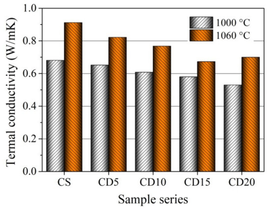 The thermal conductivity of the ceramic bodies CS, CD5, CD10, CD15, and CD20 at the two firing temperatures used, is shown in Figure 14. The thermal conductivity of the CS ceramic body (0.68 W/mK after firing at 1000 °C and 0.91 W/mK after firing at 1060 °C) is superior to that of CD5, CD10, CD15, and CD20 ceramic bodies containing OCW. Clay and diatomaceous earth are made of illite group minerals, which have a thermal conductivity of 1.8 W/mK, as well as calcite, forsterite, dolomite, and quartz, with high thermal conductivity values of 3.4, 5.03, 5.51, and 7.7 W/mK, respectively [76]. It is also worth noting that ceramic body CS has a higher quartz content (Table 2), which raises thermal conductivity [66]. The fact that the CS ceramic body has lower apparent porosity is associated with its higher thermal conductivity. Analysis of the thermal conductivity of CD5, CD10, CD15, and CD20 ceramic bodies shows that thermal conductivity results correlate with apparent porosity and density results [29,40,66].