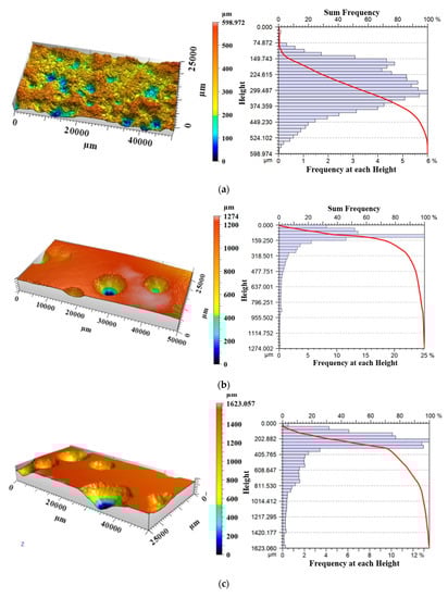 A three-dimensional non-contact surface topography scanner ST400 produced by American NANOVEA company was used to collect the surface morphologies of standard specimens with different corrosion degrees. The size of the scanning area was 50 mm × 25 mm in the test section of the specimen, as shown in the red area in Figure 2. The scanning results of some representative specimens are shown in Figure 4.