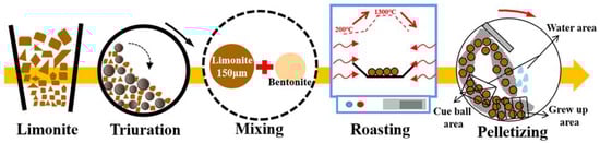 The iron and steel industry is one of the significant contributors to CO2 emissions and faces the challenge of a deficiency in high-grade ores. Sintering is an important preprocess before iron making in the blast furnace. However, the sintering process has a long flow, with enormous greenhouse gas emissions and high energy consumption [,,]. Pellets can improve the breathability in the blast furnace, which increases the reduction process’s efficiency and reduces greenhouse gas emissions. Additionally, the application of pellets can increase the tolerance of low-grade ores and thus is noticed as a cost-saving technique compared to the application of sinter [,,].