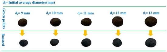 A ball mill was used to grind Guisha limonite for 72 h prior to this experiment, and an automatic screening machine was used to complete the screening. We used 200-mesh Guisha limonite powder (200 g) and combined it with bentonite in a specific proportion (0.8wt%, 1.0wt%, 1.2wt%, 1.4wt%, 1.6wt% of the mineral powder’s mass). Distilled water (3.0wt%) was added equally to the mineral powder for wetting. Distilled water (7.0wt%) was sprayed to produce pellets with a diameter of 11–15 mm. The pellets were dried for 1 h in a drying oven at 110 °C to eliminate moisture and volatiles for subsequent use. Figure 1 depicts the experimental procedure, where the experiment was carried out in 75 groups. The details of the experimental design are shown in Table 1. During the experiments, 20 pellets from each group were placed in corundum crucibles and subsequently placed in a resistance furnace for calcination in an air atmosphere. After natural cooling of the samples in air, we tested the compressive strength of the pellets according to GB/T14201-93, namely “Determination of Compressive Strength of Iron Ore Pellets” []. The change in appearance of the pellet samples during the roasting process is shown in Figure 2.