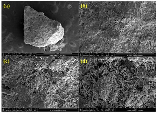 SEM of Guisha limonite: (a) 150×, (b) 2000×, (c) 5000×, (d)10,000×.