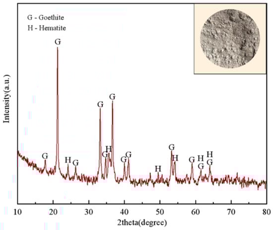 The Guisha limonite utilized in this experiment has a rough surface, a loose and porous structure, and small crystals. It is a typical highly crystalline ferrihydrite with a morphology resembling seafloor coral and a typical limonite crystalline condition. This largely determines that it has the characteristics of high porosity, strong water absorption, high wetting capacity, and easy melting. An SEM image of limonite is shown in Figure 3. Guisha limonite has 54.67% total iron concentration, making it a relatively low-grade mineral. The mass fraction of SiO2 sourced from gangue is 4.04%. It has a large variety of impurities, but the amount is minimal, and 14.82% of it is total moisture content. The different wettability of the raw materials mainly causes the difference in the growth of green pellets. When the raw material has good wettability, the water will form a film that adheres tightly to the pellet’s surface. After colliding with another pellet, a liquid bridge is formed, and the two pellets start to bond under the action of surface tension, which promotes growth. It can be found from the SEM image that the limonite particles of Guisha limonite sample are granular, with a rough surface and loose and porous structure. Guisha limonite has strong water absorption, and the wetting capacity of mineral powder is large. This means that limonite has strong surface hydrophilicity in the process of pelletizing, forming a more liquid film, which tends to bond more iron ore particles, which is beneficial to the growth of pellets. The Guisha limonite samples used in this study were from A certain Iron and Steel company in Yunnan Province, the chemical composition of which is shown in Table 2. X-ray diffraction was used to describe the material, and the limonite XRD pattern is displayed in Figure 4. The pattern revealed that FeOOH, which contains a significant amount of crystal water, is the primary mineral form of limonite. The bentonite selected in the experiment contains 85.97% montmorillonite, the montmorillonite content is high, and the physical and chemical properties of the bentonite are also good. The data are shown in Table 3.