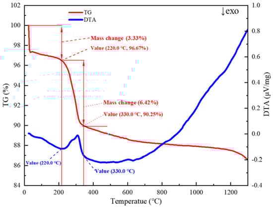 Crystal water desorption is a critical step in the limonite roasting process, primarily affected by oxidized pellets’ quality. The adsorbed water and crystal water of Guisha limonite will be lost during the roasting process as the material temperature rises. Figure 5 depicts the thermal–thermogravimetric (TG-DTA) curve of Guisha limonite samples, showing that the limonite has a noticeable weight loss before 220 °C and the initial weight loss is 3.33%. The weight loss of the sample is primarily caused by the loss of primarily surface moisture when the temperature is less than 220 °C, based on thermodynamics. When the temperature rises above 220 °C, the crystal water in the minerals begins to evaporate. When the temperature was raised to 220 °C, the limonite decomposed violently, resulting in an endothermic peak in the DTA curve, as shown in Equation (1).