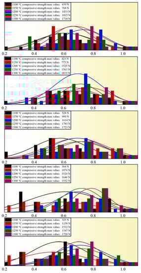 The diameter of pellets was controlled to be 9–13 ± 0.5mm, and the addition of bentonite was 0.8wt%, 1.0wt%, 1.2wt%, 1.4wt%, and 1.6wt%. The experiments were carried out in 25 groups to study the effect of roasting temperature on the compressive strength of pellets, with 20 pellets for each group. Figure 7 depicts the experimental outcomes. The normality test and linear analysis were carried out for 25 groups of experimental data. The analysis results are shown in Figure 8. The effect of roasting temperature on pellet compressive strength is substantial. When the temperature is between 1100 °C and 1250 °C, the compressive strength of pellets increases in a positive relationship with the roasting temperature, and the strength is virtually the same between 1250 °C and 1300 °C. As a result, the ideal roasting temperature for pure limonite pellets is around 1250 °C 1300 °C. This finding is because the strength of the pellets is mainly determined by the iron ore’s oxidative recrystallization process. The volume of the pellets will alter during the crystallization process. The higher the degree of crystallization, the faster the pellets expand as the temperature rises. It generates fissures in the pellets, diminishing their strength, and the effect on strength becomes more evident as the temperature rises.
