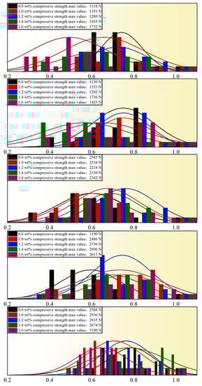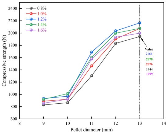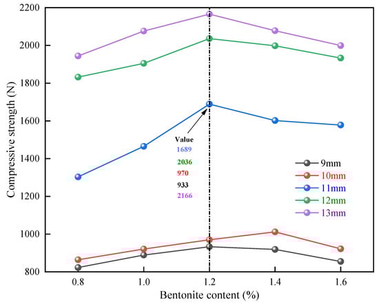The diameter of the pellets was controlled to be 9 mm, 10 mm, 11 mm, 12 mm, and 13 mm, and the calcination temperature was 1250 °C. The experiments were carried out in 25 groups to study the effect of the additional amount of bentonite on the compressive strength of the pellets, with 20 pellets for each group. The experimental results are shown in Figure 11. Twenty-five groups of experimental data were examined using the normality test and the linear analysis. Figure 12 displays the analysis findings. With the increased bentonite content, the pellet strength increases and decreases. When the bentonite content is below 1.2wt%, there is a positive correlation, and the effect is very significant; when the bentonite content is between 1.2wt% and 1.6wt%, the strength gradually decreases with the increase in bentonite content. It can be seen that the optimum addition amount of bentonite is about 1.2wt%.