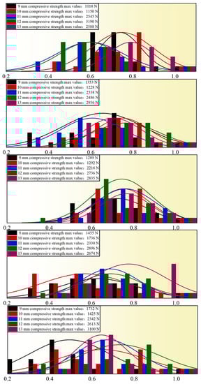 To investigate the influences of pellet diameter on compressive strength, the bentonite addition amount was regulated at 0.8wt%, 1.0wt%, 1.2wt%, 1.4wt%, and 1.6wt%, and the calcination temperature was 1250 °C. The experiments were carried out in 25 groups, with 20 pellets for each group. Pellets with diameters ranging from 9 mm to 13 mm were used for the compressive strength test. Figure 9 depicts the experimental findings. For 25 groups of experimental data, the normality test and linear analysis were performed. Figure 10 illustrates the analysis results. The compressive strength of the pellets does not vary much within a diameter range of 9–10 mm. It shows a growing tendency with the rise of the pellet diameter within the diameter of 10–13 mm, and the range exceeds 1000 N. This demonstrates that pellet diameter has a significant influence on pellet compressive strength. However, if the pellet diameter is too large, the unit heat consumption will be excessive, the oxidation will be insufficient, and the roasting and chilling time will be extended. As a result, the ideal pellet diameter is around 13 mm.