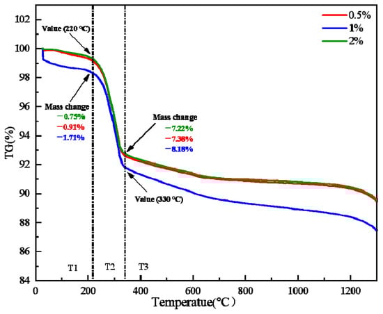 The desorption of crystal water from limonite is the main reason for the decrease in pellet strength [,,]. To investigate the effect of bentonite on the desorption of crystal water, limonite powders with bentonite contents of 0.5wt%, 1wt%, and 2wt% were taken for differential thermal-thermogravimetric (TG-DTA) analysis. In an air atmosphere, the thermogravimetric (TG) and differential thermal (DTA) curves are shown in Figure 13 and Figure 14, respectively. Based on the thermogravimetric curve (Figure 13), it was discovered that the starting and ending temperatures of limonite crystal water desorption are basically the same when different contents of bentonite are added. It shows that the addition of bentonite has no significant effect on the desorption process of limonite crystal water. Analysis of the differential heat (DTA) curve (Figure 14) shows that the endothermic peak intensities of limonite at 200–400 °C are the same when the addition of bentonite is 0–2wt%. It shows that the addition of bentonite has no significant effect on the endothermic or exothermic effect of the desorption process of crystal water. Studies have demonstrated that the desorption performance of crystal water depends only on the degree of its binding to the ore []. The function of bentonite is mainly reflected in increasing the nucleation rate, green ball strength, and reducing the growth rate of green balls in ball making. It can be further inferred that the effect of bentonite on the compressive strength of pellets is mainly achieved by changing the pore structure.