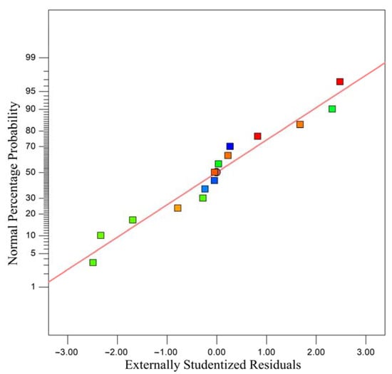 Figure 15 shows the normal distribution of residuals of the strength of pure limonite pellets. Random scattering patterns that do not follow a specific shape near a straight line indicate the high accuracy of regression modeling. The experimental points are approximately a straight line, indicating that the experimental selection model can be used to predict the experimental process within the normal range of the experimental residual distribution.