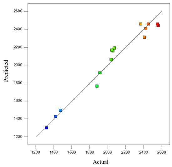 The Box–Behnken experimental design was carried out using Statistical methods, and the experimental results are shown in Table 5. The quadratic model was used to perform regression fitting on the experimental results in Table 5. The mathematical prediction model of each influencing factor of the compressive strength of pure limonite pellets is established, as shown in Equation (3).