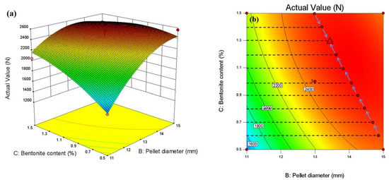 A 3D response surface plot shows the effect of model parameters on compressive strength. When the calcination temperature is 1300 °C, the response surface between the pellet diameter, the bentonite content, and the pellet compressive strength is shown in Figure 17a. It can be seen from the response surface in the figure that the experimental range is that the diameter of the pellet is 11–15 mm, and the ratio of bentonite is 0.5–1.5wt%. In the pellet diameter range of 11–13 mm, the compressive strength increases with the increase in pellet diameter; when the pellet diameter increases to 15 mm, the compressive strength decreases. In the bentonite ratio range of 0.5–1.3wt%, the compressive strength increases with the increase of the bentonite ratio, and the effect is significant on compressive strength. When the bentonite ratio is between 1.3wt% and 1.5wt%, the compressive strength declines as the bentonite ratio increases, essentially consistent with the results of the single-component experiment.
