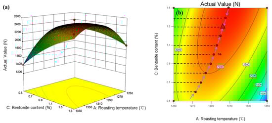 The response surface between the calcination temperature, the content of bentonite, and the compressive strength of the pellet when the diameter of the pellet is 13 mm is shown in Figure 18a. It can be seen from the curved surface in the figure that the experimental range is the calcination temperature of 1250 °C–1350 °C, and the ratio of bentonite is 0.5–1.5wt%. In the calcination temperature of 1250 °C–1300 °C, the compressive strength increases with the increase in calcination temperature. When the calcination temperature is between 1300 °C and 1350 °C, the compressive strength decreases with the increase in calcination temperature. In the bentonite ratio range of 0.5–1.3wt%, the compressive strength increases with the increase in bentonite ratio. In the bentonite ratio range of 1.3–1.5wt%, the compressive strength decreases with the rise in bentonite ratio, consistent with the univariate results.