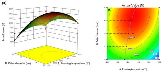 Response surface plot between pellet diameter, roasting temperature, and pellet compressive strength: (a) 3D response surface plot, (b) optimal parameter contour plot.